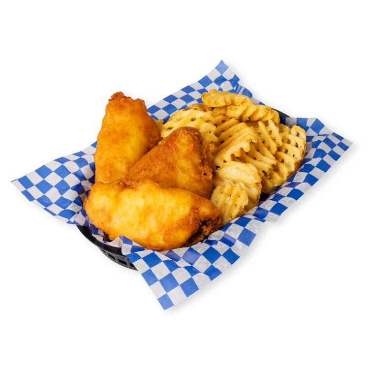 3 pieces hand battered golden fried haddock, served with waffle fries and a fountain pop.